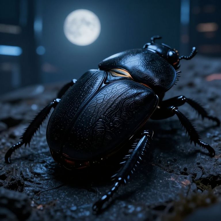 Black carapace of a futuristic armored beetle gleaming under moonlight, intricate patterns on shell, cyberpunk city background, ultra-detailed close-up