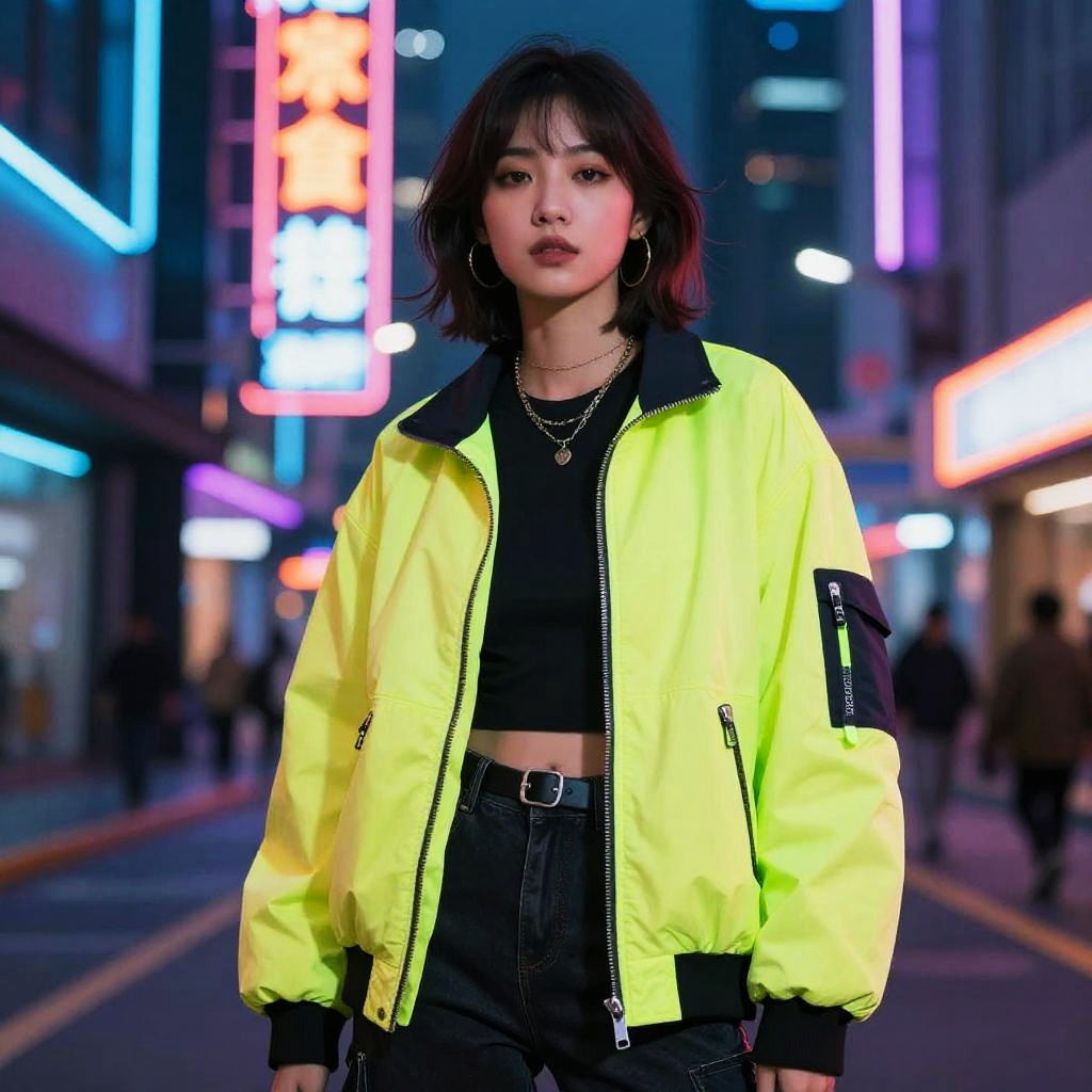This vibrant and futuristic image features a young woman in a striking neon-accented jacket, standing confidently in a neon-lit urban environment. The colorful backdrop enhances the edgy style, capturing the essence of modern street fashion and nightlife.