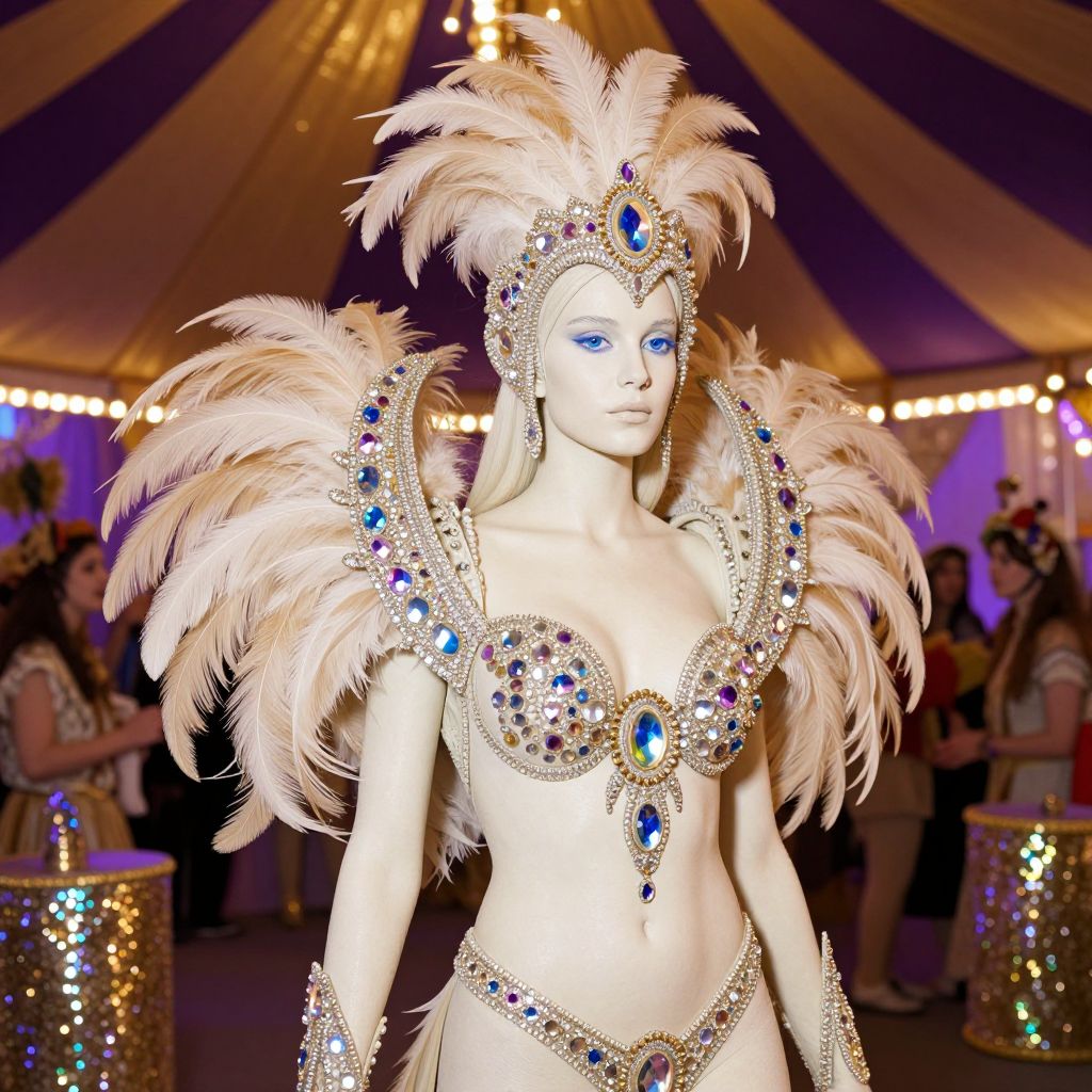 Photograph of a white mannequin dressed in a glittering, white feathered Carnival costume with blue gemstones, standing in a brightly lit circus