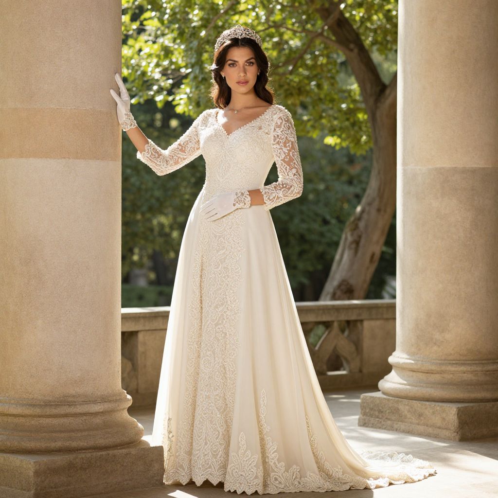 Photograph of a beautiful woman with medium brown skin and dark, wavy hair, wearing a white lace wedding dress with long sleeves and a V-neckline. She stands between two tall, beige stone columns, one hand resting on the column. She wears a delicate tiara and holds a white glove in her other hand. The background shows a sunlit garden with green trees and a stone balustrade. The dress features intricate lace patterns and a flowing, elegant skirt. The lighting creates a warm, sunny atmosphere, highlighting the textures of the lace and the stone columns.