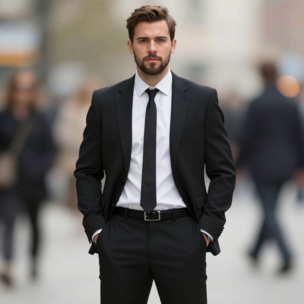 Photograph of a handsome, bearded white man with short brown hair, standing in a blurred urban street scene. He wears a black suit, white dress shirt, and black tie, with hands in his pockets. His expression is serious and confident. The background features indistinct figures in dark clothing, with a mix of blurred buildings and pavement. The overall style is sharp, modern, and professional, emphasizing his stylish, business-like appearance.