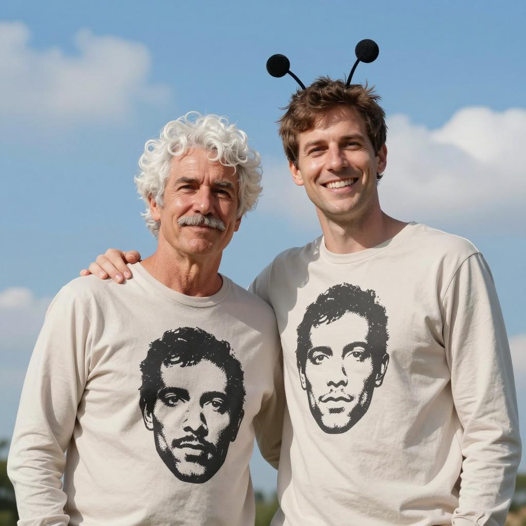 Photograph of three men on a beach. The man in the center wears a blue jacket, white striped shirt, and beige pants, with sunglasses. The man on the left wears a blue shirt and brown shorts, standing straight. The man on the right wears a floral jacket, yellow shirt, and red plaid shorts, leaning on the center man. Blue sky with white clouds, ocean in background. All smiling, relaxed, standing on sandy shore.