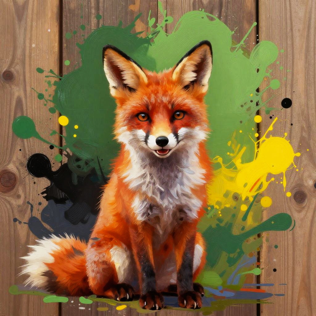 This is a digital drawing of a fox with vibrant orange fur, white accents on its face and chest, and black-tipped ears. The fox's piercing yellow eyes look directly at the viewer, and its fluffy tail curls around its body. The background is a stark white, making the bright colors of the fox pop even more. The style is vivid and slightly abstract, with bold, expressive brushstrokes.