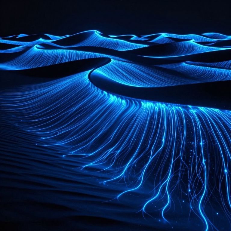 A mesmerizing 3D-rendered depiction of bioluminescent dunes bathed in a cyberpunk-inspired blue glow, where rhythmic pulses of light cascade like waves, creating a surreal, high-definition landscape visible only through the lens of nocturnal vision.