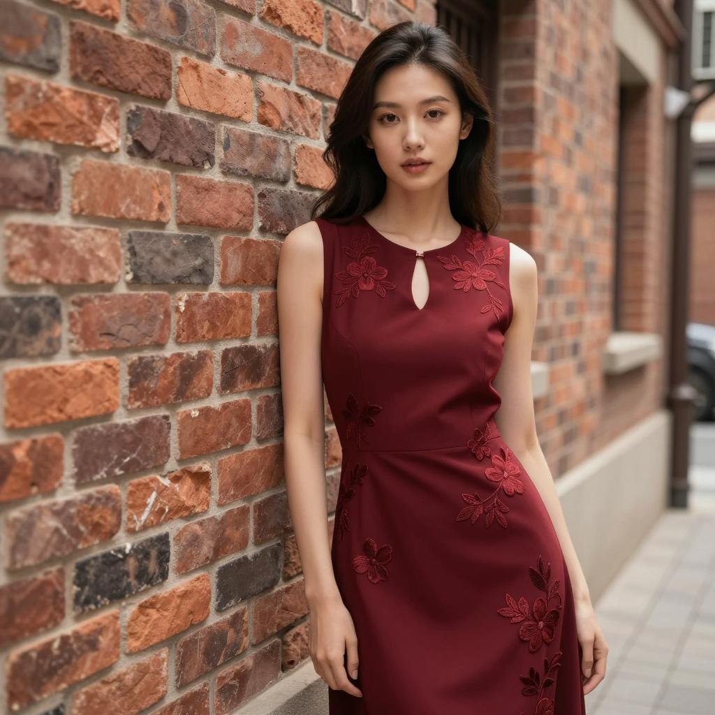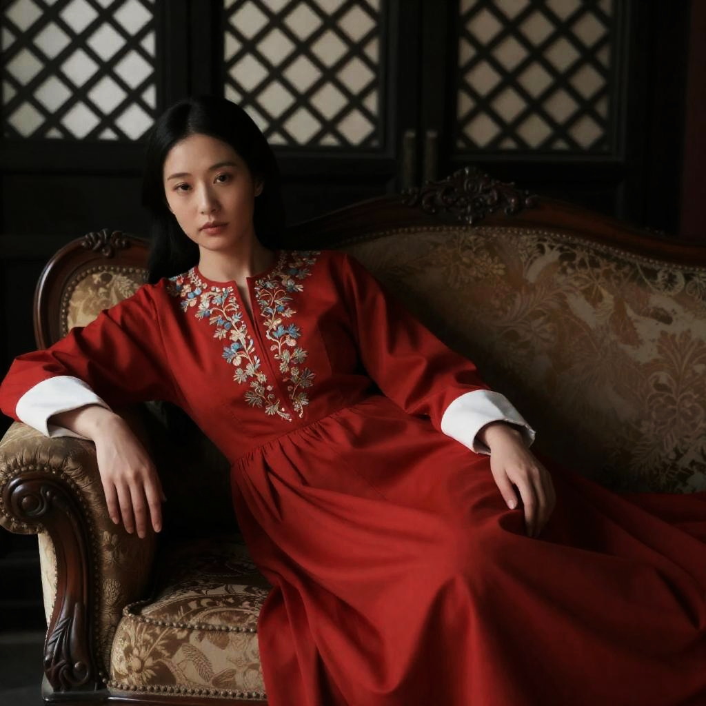Woman in red, embroidered gown with white cuffs, reclining on ornate, patterned sofa. Dark background, black lattice window. Hand on armrest, other hand on skirt. Dark hair, neutral expression. Rich ures, historical style. Indoor setting.