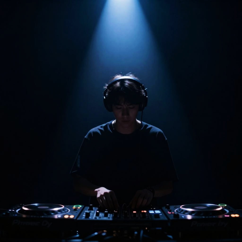 Silhouetted DJ, back to camera, stands in dark room, illuminated by bright blue spotlight. Hands on DJ mixer. Dark background. Blue light beam pointing upward. DJ's head and shoulders visible, hair slightly tousled.