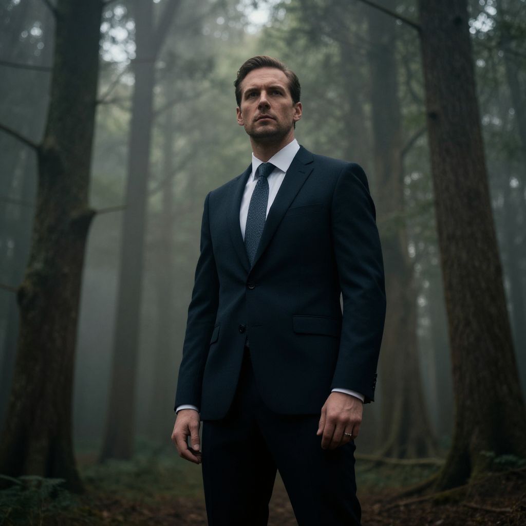 A sharply dressed man stands confidently in a misty, dense forest with tall trees surrounding him. The dramatic lighting and muted color palette create a moody and cinematic atmosphere, emphasizing his serious expression and polished appearance.