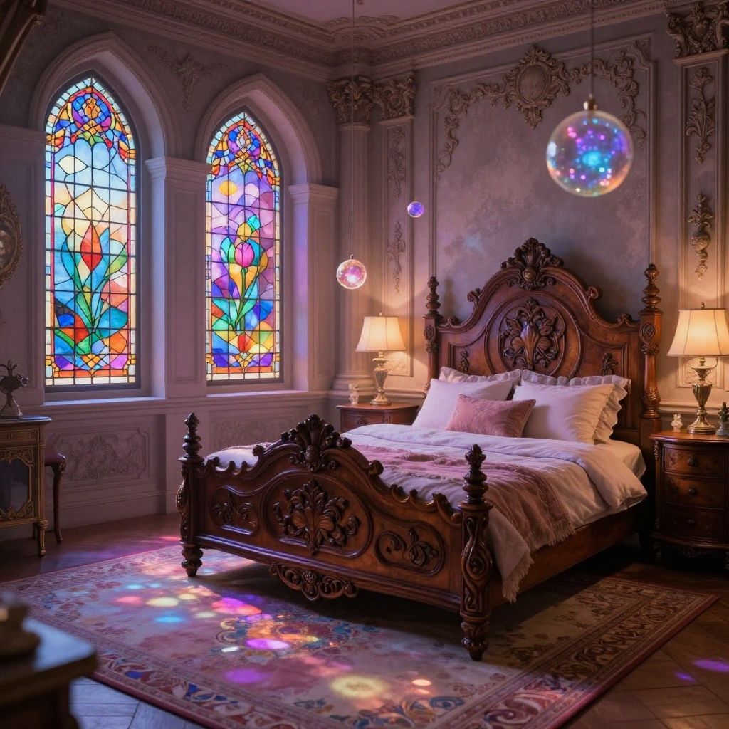 Bedroom fantasy inspired by a fairytale castle, ornate carved wood furniture, plush carpets, stained glass windows casting colorful lights, magical floating orbs illuminating room, dreamy vibe