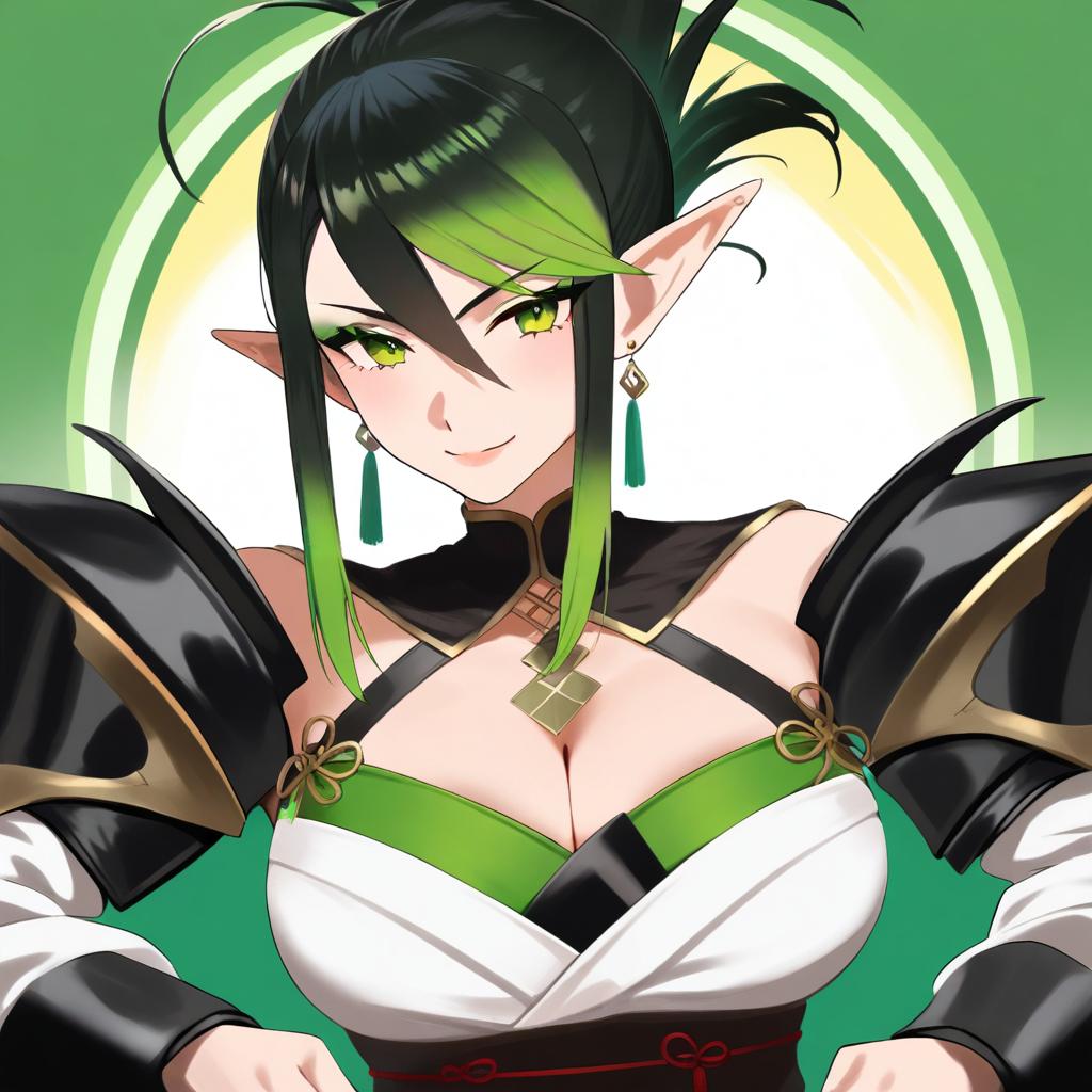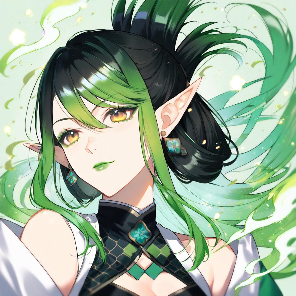 Hanabatake chaika, nijisanji, 1boy, green lips, pointy ears, yellow eyes, green eyeshadow, black hair, green hair, long hair, gradient hair, folded ponytail, virtual youtuber, virtual youtuber, earrings, elf, lipstick, by artist wasabi (sekai), animagine