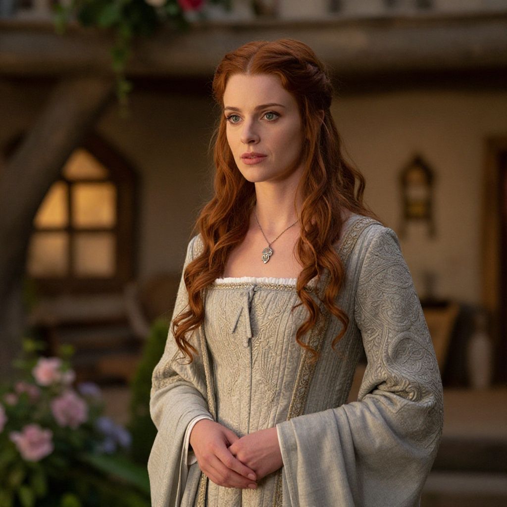 Photograph of a fair-skinned woman with long, wavy, auburn hair, wearing a gold pendant necklace and a blue, textured, medieval-style cloak over a white, intricately embroidered dress. She stands in front of a blurred, rustic, half-timbered house with warm, yellow wall lights and flowerbeds with pink and white flowers. Her expression is serious, and her hands are gently clasped in front of her. The image has a warm, golden glow, enhancing the historical, fairy-tale atmosphere.