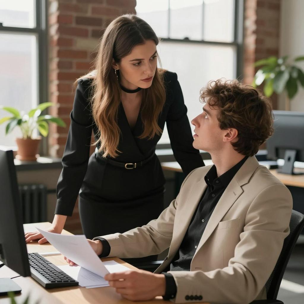 A professional office setting with a young woman and man engaged in a serious conversation. The woman, with long brown hair and wearing a black choker and black dress, leans over the desk. The man, dressed in a beige blazer and black shirt, sits at the desk holding papers. The background includes a computer, brick walls, windows, and potted plants with natural sunlight entering the room.
