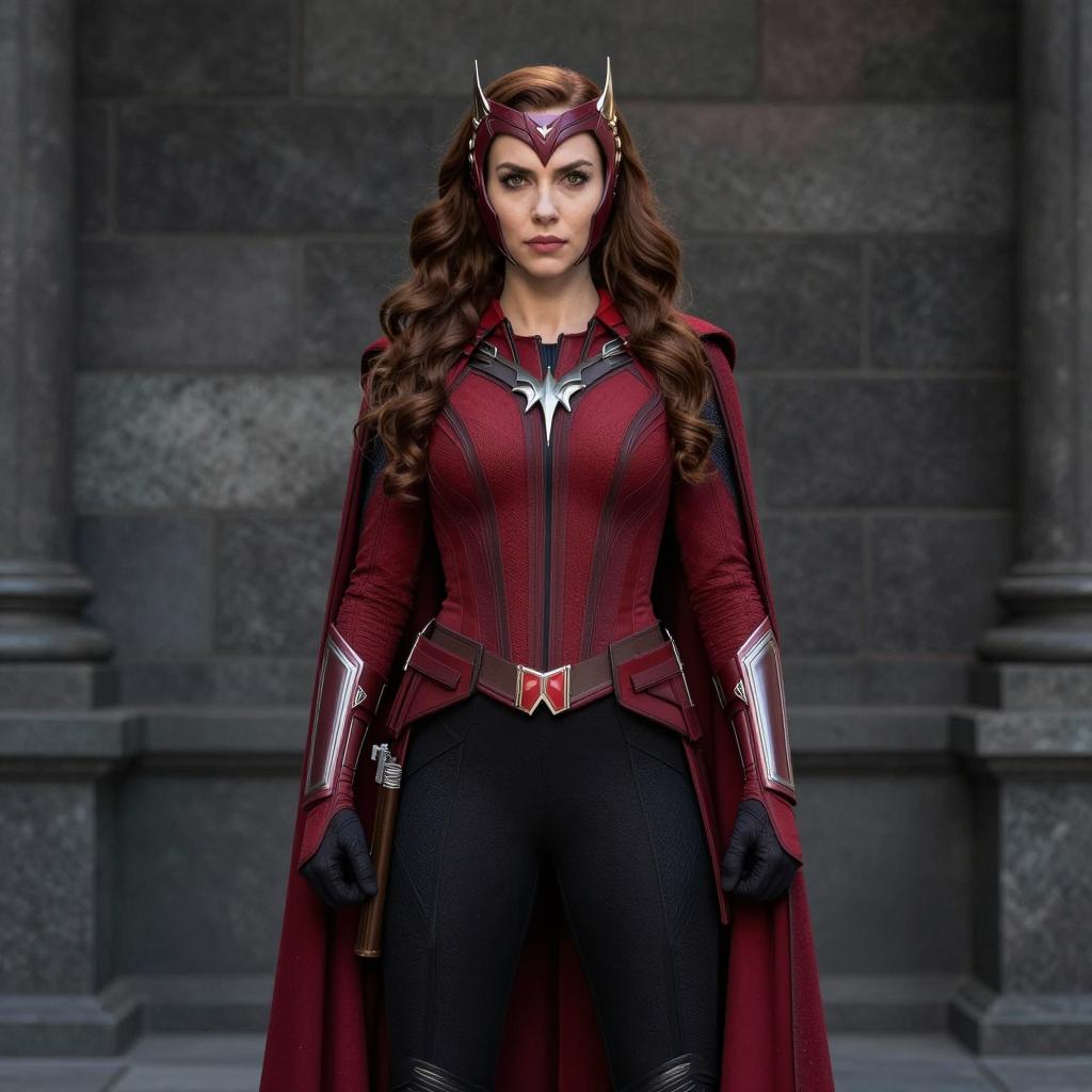 Scarlet witch crown, photorealistic, fantasy queen, standing in forest path, autumn leaves, detailed armor, red and black outfit, gold crown with red gems, long brown hair, serious expression, medieval style, dark green forest background, sunlight filtering through trees, full body shot, centered, realistic ures, detailed ures on armor and fabric, photo-realistic style, fantasy character, strong, regal, majestic, high contrast lighting, natural light, detailed shadows