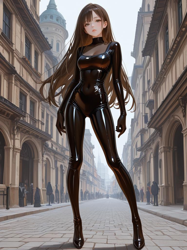 Digital artwork of a tall, slender woman with long brown hair standing confidently in the middle of a narrow, cobblestone street lined with historic, ornate buildings. She wears a tight, black, shiny latex bodysuit with long sleeves and high heels, accentuating her hourglass figure. Her expression is neutral, with pale skin and subtle makeup. The background shows a bright, overcast sky and distant architectural details, creating a sense of depth. The image blends realistic and anime-style elements, emphasizing the character's striking appearance against the classic European street setting.