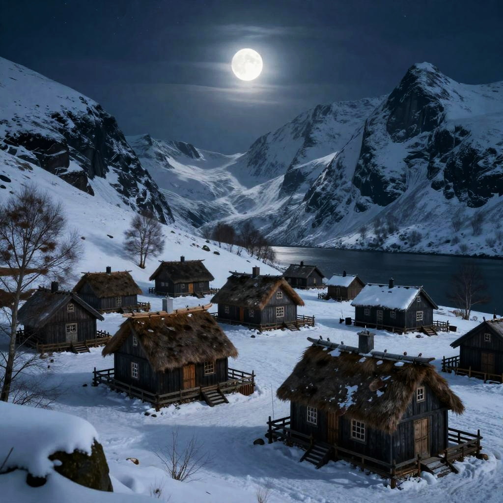 Highly detailed and photorealistic image of a Nordic Viking village in a wind-swept mountain pass. The village should be composed of intricately detailed wooden houses with thatched roofs, surrounded by snow-covered mountains and tall trees. The lighting should be pale moonlight with starlit sky. The camera should be positioned at a low oblique angle (looking up at the village from a snowdrift), looking up at the village and the surrounding landscape. The lens should be a wide-angle lens to capture the expanse of the landscape and the details of the village. The image should feel immersive and authentic, with every element carefully crafted to create a realistic and compelling scene.
