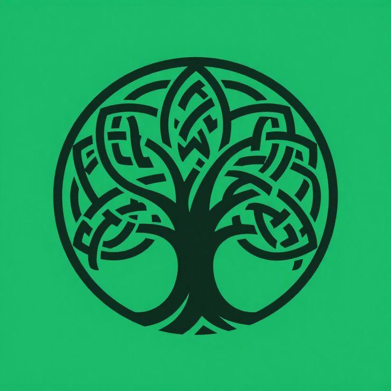 A modern, bold, flat illustration of a Celtic knot tree of life in a circle format with a clean, emerald background.