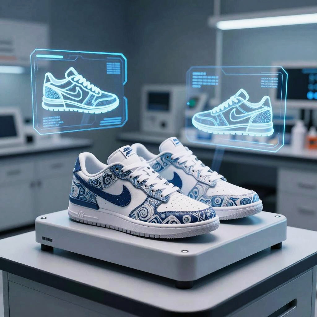 A shoe generator device creating unique, stylish sneakers with intricate patterns, surrounded by holographic shoe designs, modern laboratory setting, blue and neon accents, high-tech vibes, digital art style, showcasing creativity and technology merging.