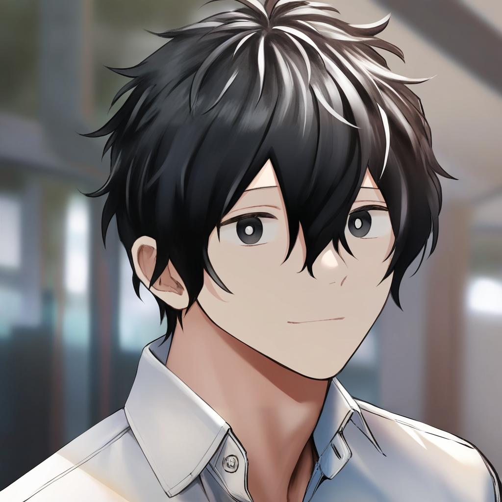 Digital anime-style portrait of a young man with messy, black, shaggy hair and large, expressive gray eyes. He has a fair skin tone and a slight, confident smile. He is wearing a white, collared shirt with a button-up front. The background is softly blurred, featuring indistinct, bright lights and dark shadows, suggesting an indoor setting. The artist uses smooth shading and highlights to create a three-dimensional appearance, emphasizing the character's youthful and attractive features. The overall style is clean and modern, typical of contemporary anime artwork.