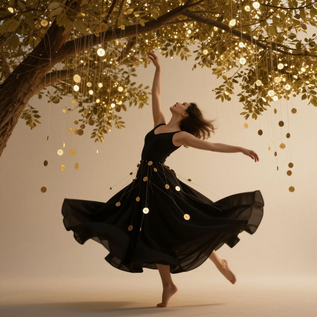 A digital artwork depicts a woman in a flowing black dress adorned with golden coins suspended by delicate threads, dancing gracefully beneath a tree whose branches cascade with shimmering leaves, creating a magical, ethereal atmosphere enhanced by soft, golden-hour lighting.