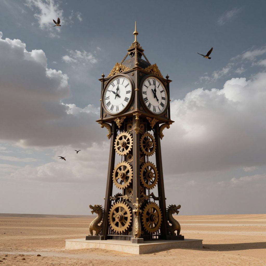 Surreal clock tower stands isolated in a desolate desert landscape, its two large Roman numeral clocks facing forward and backward, flanked by intricate mechanical gears and ornate dragon-like sculptures, while three birds soar against a dramatic sky, hinting at the passage of time in reverse.