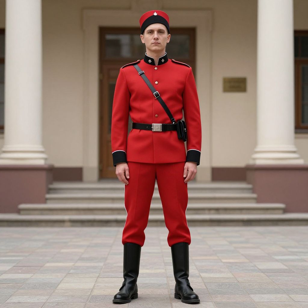 Photograph of a young, Caucasian male soldier standing at attention in front of a building with white columns. He wears a bright red military uniform with black trim, black belt, and black boots, accompanied by a red cap with a black brim. A black crossbody strap is slung over his left shoulder. The background features a stone-paved ground, beige walls, and a brown door slightly obscured by columns. The soldier has a serious expression and stands with his hands by his sides. The image is sharply focused, with a clear, balanced composition.