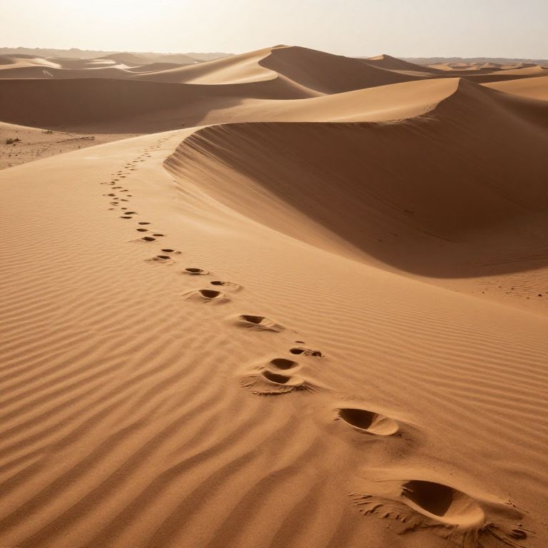 Photograph of sunlit, rippled sand dunes with a single trail of footprints winding through the golden, textured desert landscape.