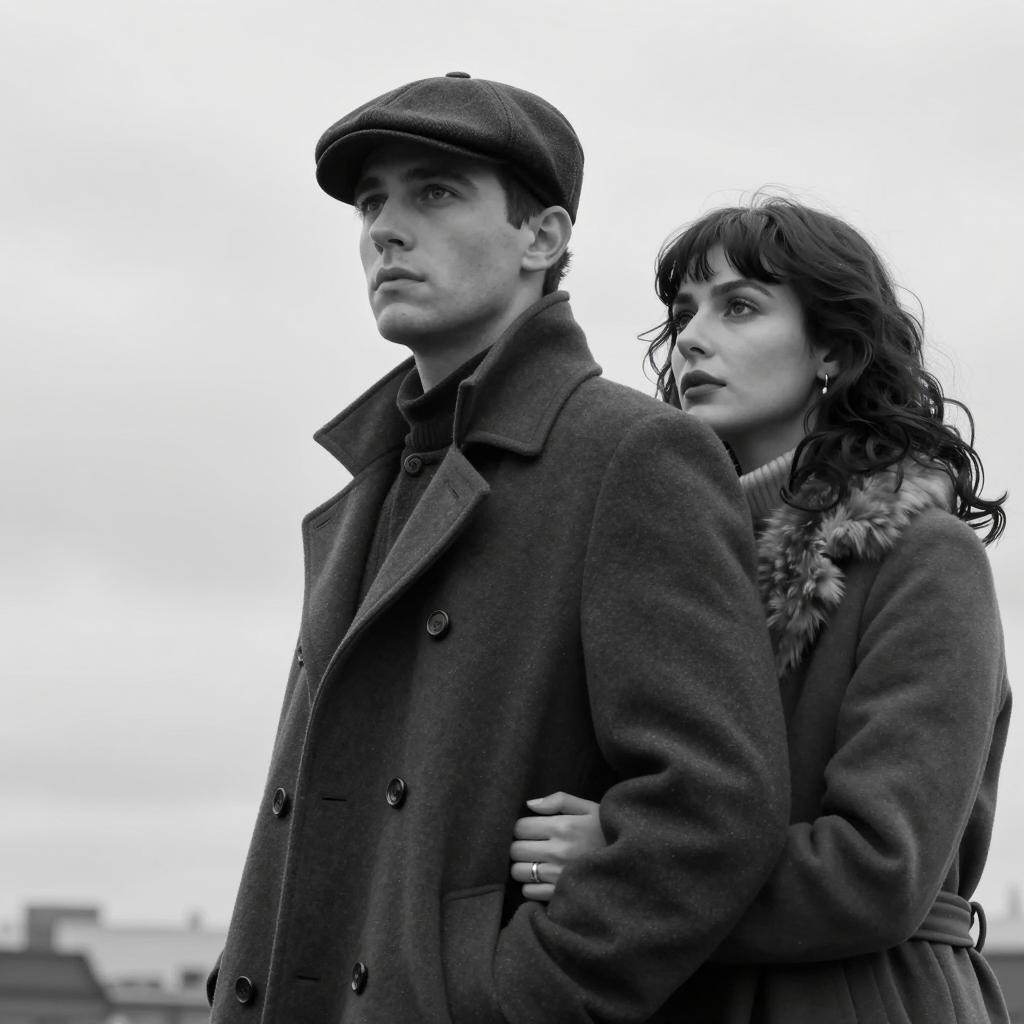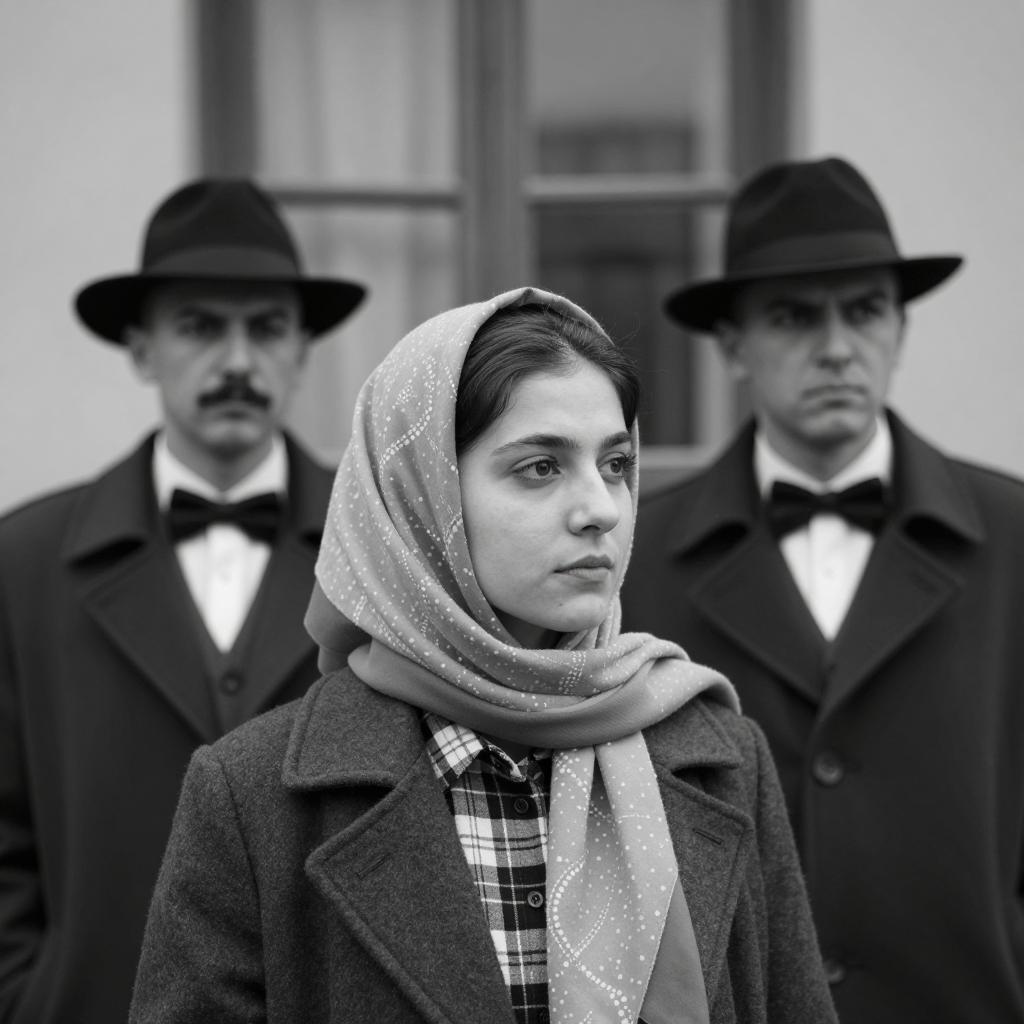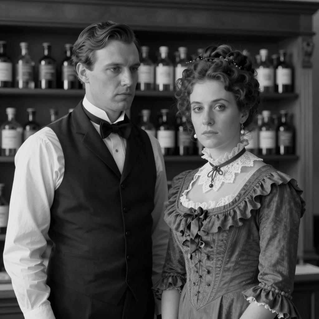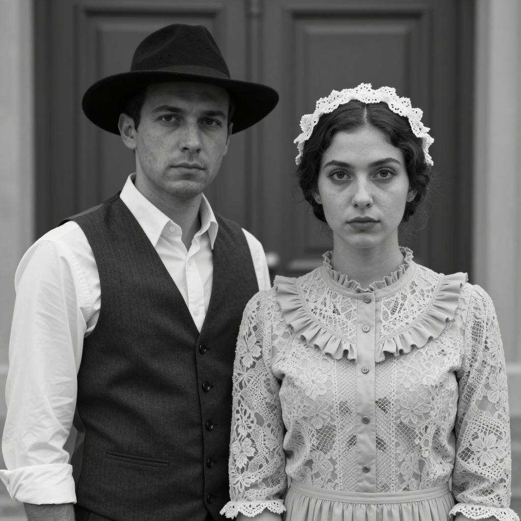 Black and white photograph of a man and a woman. Man in dark vest, white shirt, black hat, standing left, serious expression. Woman in front, light-colored lace dress with ruffled collar, lace headpiece, neutral expression. Wooden door background. Man slightly behind woman, both facing camera.