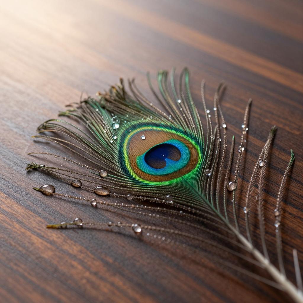 Macro close-up of wet peacock feathers with water droplets on deep mahogany wooden table under warm golden hour glow, 8K resolution, minimalistic, bright, authentic, healthy, vibrant, photorealistic.