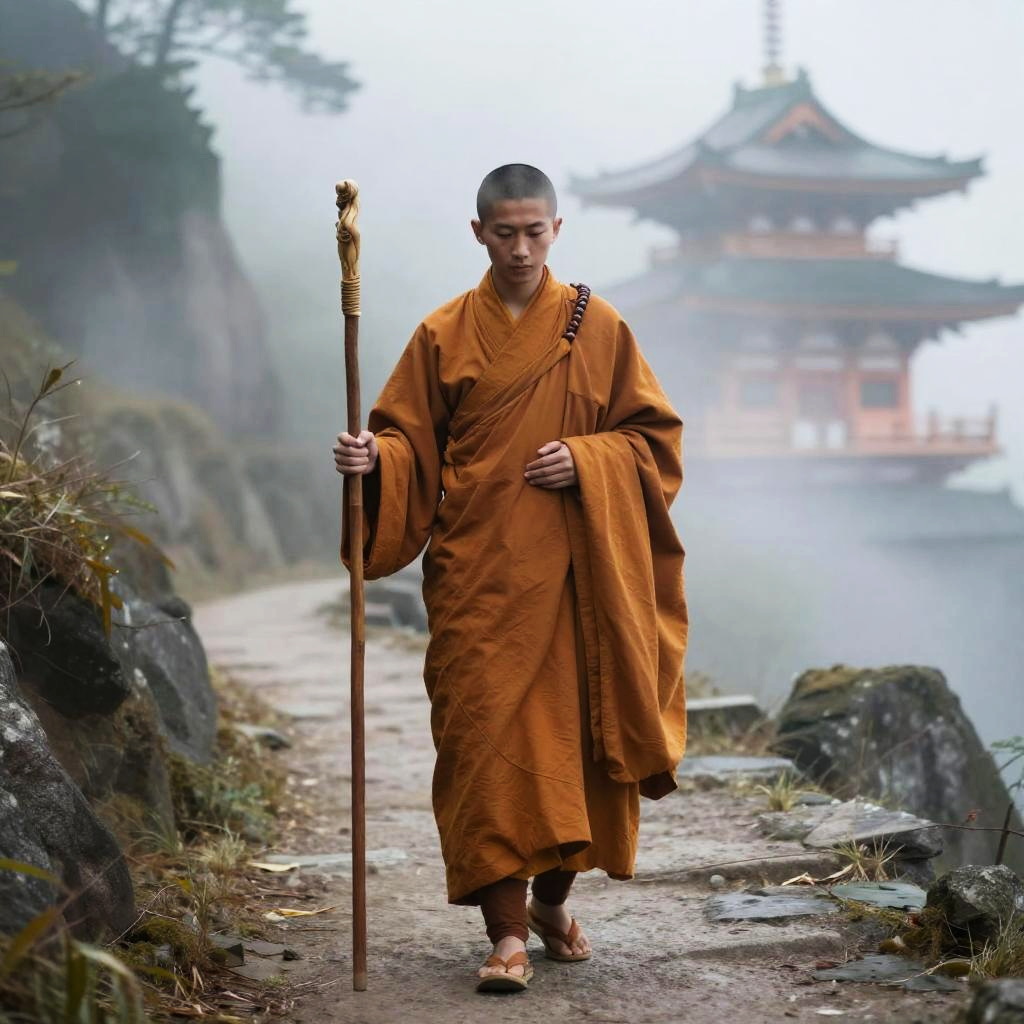 Mystical Monk on Foggy Mountain Path