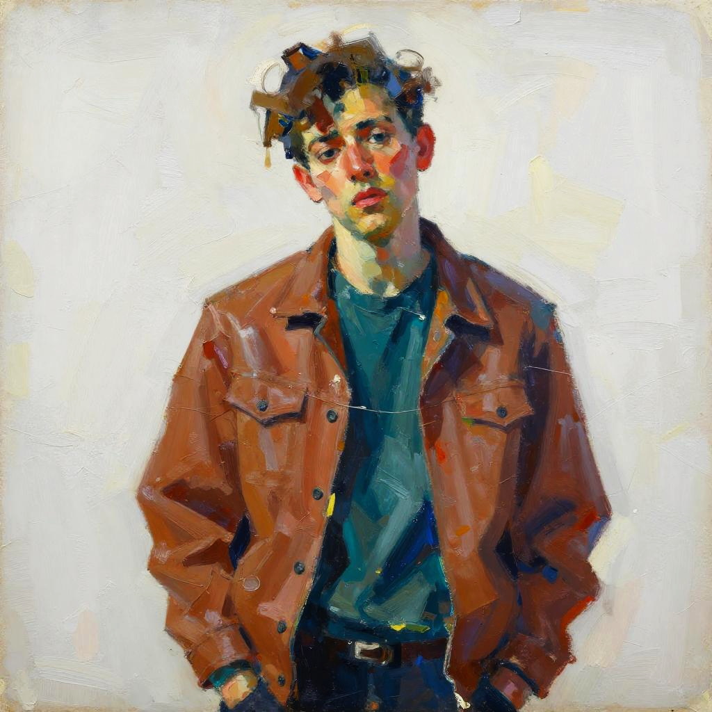 Expressionist semi-abstract portrait of fragmented young man in burnt sienna jacket and broken teal arms, rendered in neo-fauvist oil painting with thick bristle brushstrokes and textured layering, high-contrast bold colors, loose gestural strokes and textured paint ridges, minimal white negative space with asymmetrical crop, cobalt-shadow accents and suggestive contours, emotive raw ambition intertwined with subtle doubt, contemporary art poster vibe, painterly chaos with subtle drips, unresolved edges, luminous highlights.