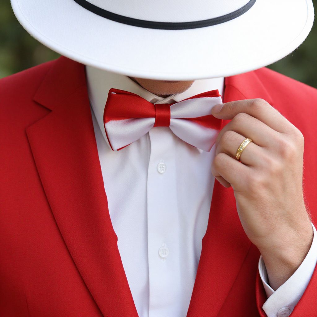 Photograph of a person in a red suit jacket, white dress shirt, and red bow tie, adjusting the bow tie with their right hand, which has a gold wedding ring. The person is wearing a white wide-brimmed hat with a black trim. The image focuses on the upper torso, showcasing the vibrant red jacket and contrasting white shirt. The background is blurred, featuring green foliage, suggesting an outdoor setting. The textures of the suit jacket and bow tie are smooth and polished, while the shirt is crisp and buttoned.