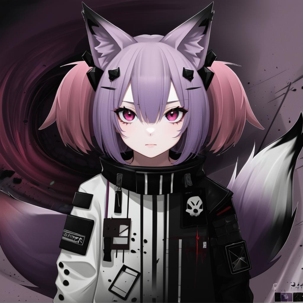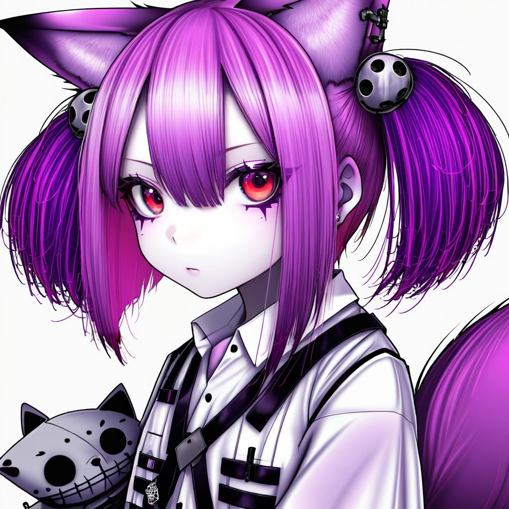 Morte (arknights), arknights, 1girl, fox girl, animal ear fluff, fox ears, fox tail, hair between eyes, pink eyes, red eyes, pink hair, short hair, purple hair, twintails, hair ornament, white shirt, stuffed animal, by artist oouso, anime