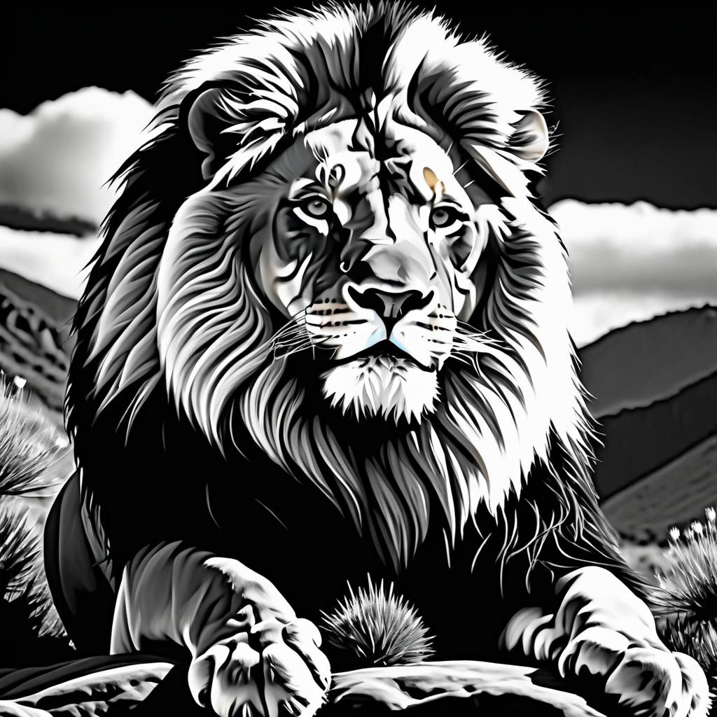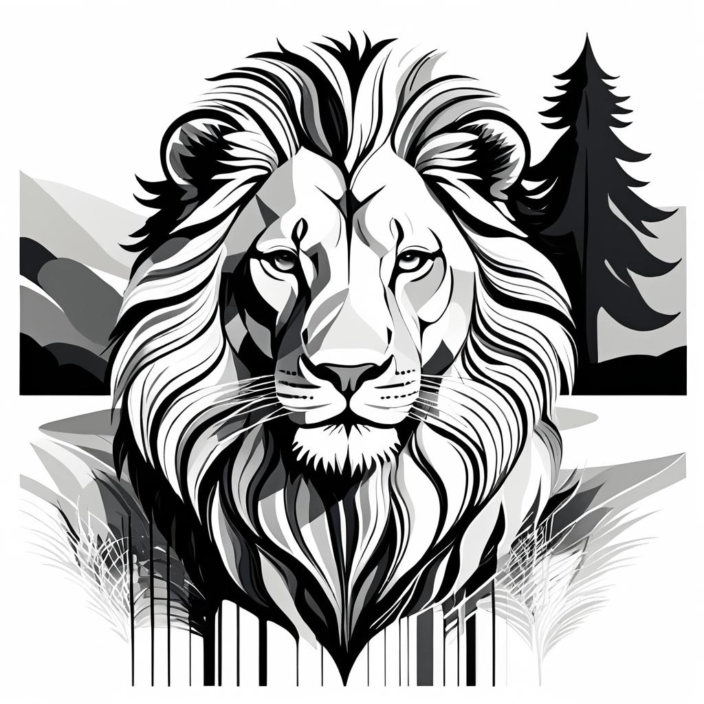 A high-quality hand-drawn digital illustration of a lion's head in a minimalistic monochrome style with intricate black and white patterns. The lion's mane is stylized with flowing lines and shading, set against a white background featuring abstract elements like a tree and mountains in grayscale tones.