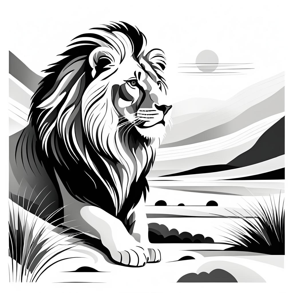 Landscape painting of a hand-drawn illustration of a lion, in a minimalistic style with monochrome patterns on a white background, high quality.