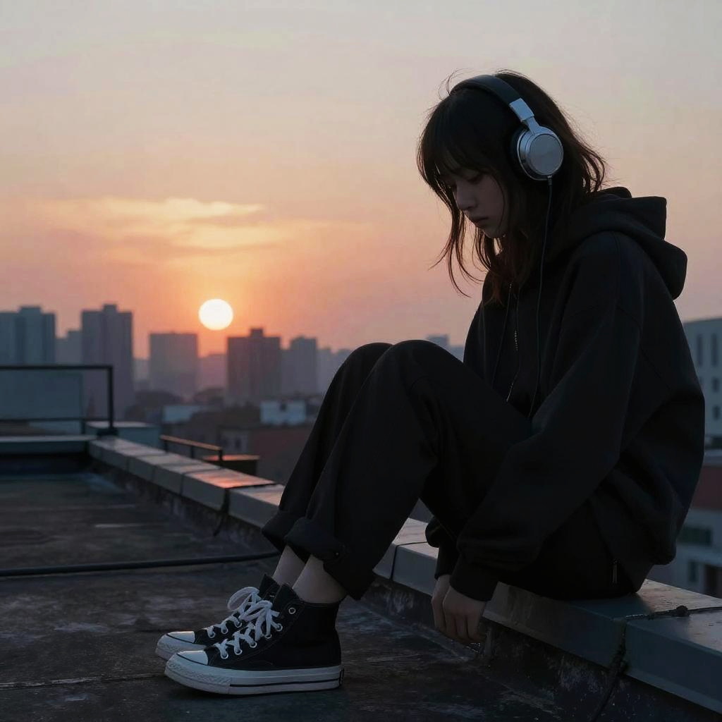 Doomer girl sitting alone on a rooftop at sunset, wearing dark clothes and headphones, city skyline in the background, moody and introspective atmosphere, digital art style
