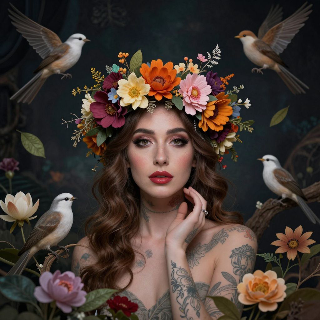 A surreal, dreamlike image of a woman's face with tears and flowers, surrounded by a mystical, opulent frame, evoking a sense of melancholy and otherworldliness.