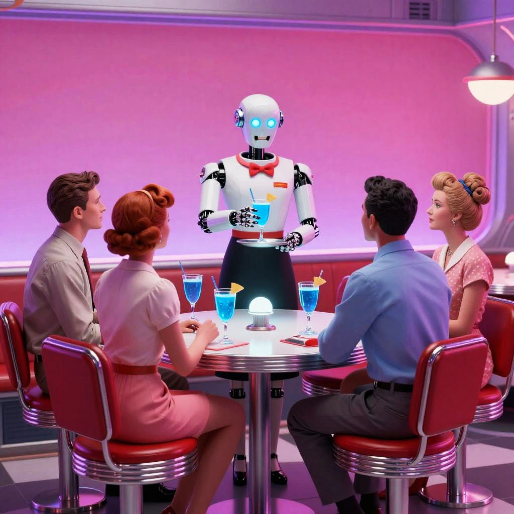 Retro futurism digital art set in a brightly lit diner inside a spaceship, depicting a robot waitress serving glowing blue drinks to a group of humans in 1950s attire seated on red leather stools. The background falls from deep magenta to soft lavender in a smooth gradient. Whimsical tone, refined composition, tactile detail, vibrant color, soft rim light, subtle texture, high detail, balanced layout.