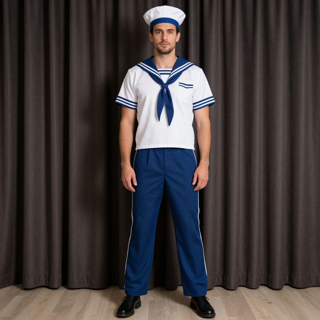 Sailor Costume Male, man in a sailor suit standing in front of a curtain