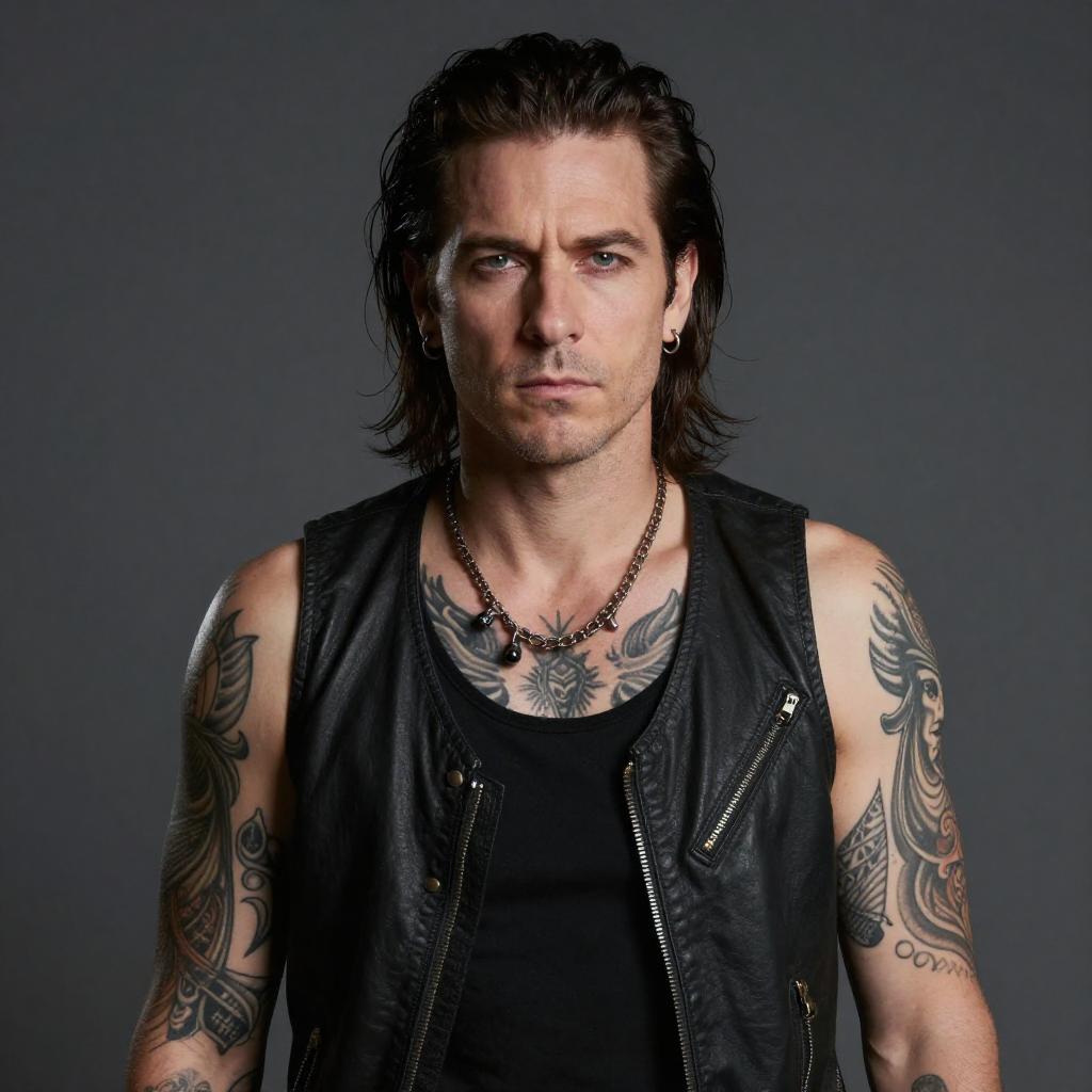 Photograph of a tattooed, serious-looking man with wet, dark hair, wearing a black leather vest and tank top, against a dark gray background