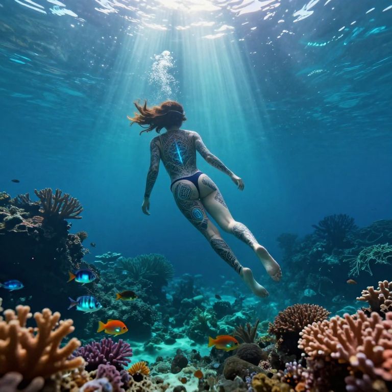 Photograph of a woman with intricate blue tattoos, wearing a patterned swimsuit, swimming underwater surrounded by vibrant coral reefs and colorful fish. Sunlight