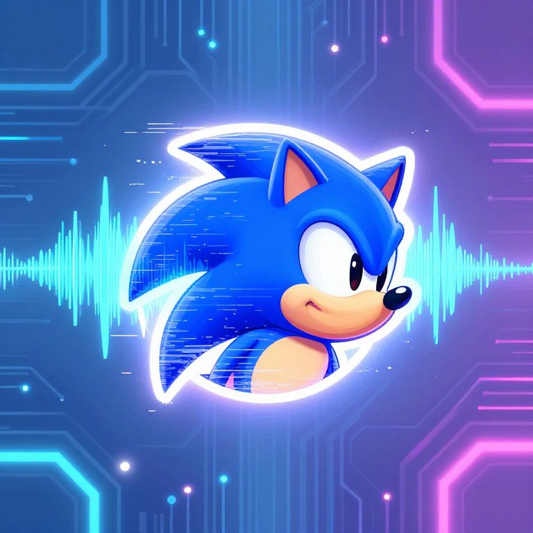 Sonic logo generator design, rhythmic audio waves morphing into creative brand logos, electric pastel tones with pixelated glitch overlays, modern abstract background featuring circuit board patterns and pulsating neon lights
