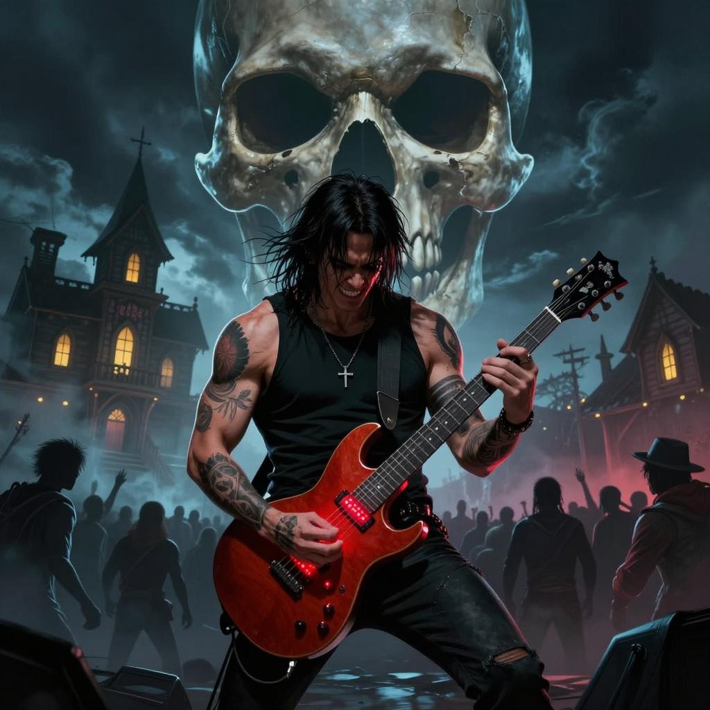 Illustration of a muscular man with dark hair and tattoos, playing an electric guitar with glowing red pickups. Large, menacing skull with hollow eyes in the background. Dark, stormy sky with blue and black hues. Crowded, shadowy crowd below. Haunted house with yellow lights in the background. Man stands in front, mid-performance, intense expression. Vibrant, dramatic colors.
