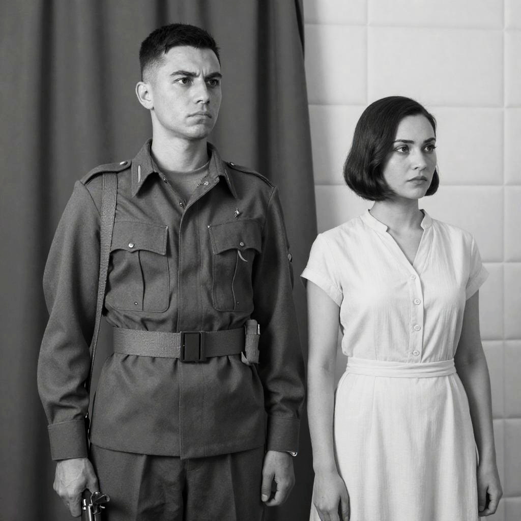 Black and white photograph of a serious soldier in a military uniform with a belt, standing beside a short-haired woman in a light dress, looking to the right. Both are near a draped curtain and a quilted wall. Soldier holds a rifle. Soldier's expression is stern, woman's expression is neutral. Soldier stands to the left, woman to the right.