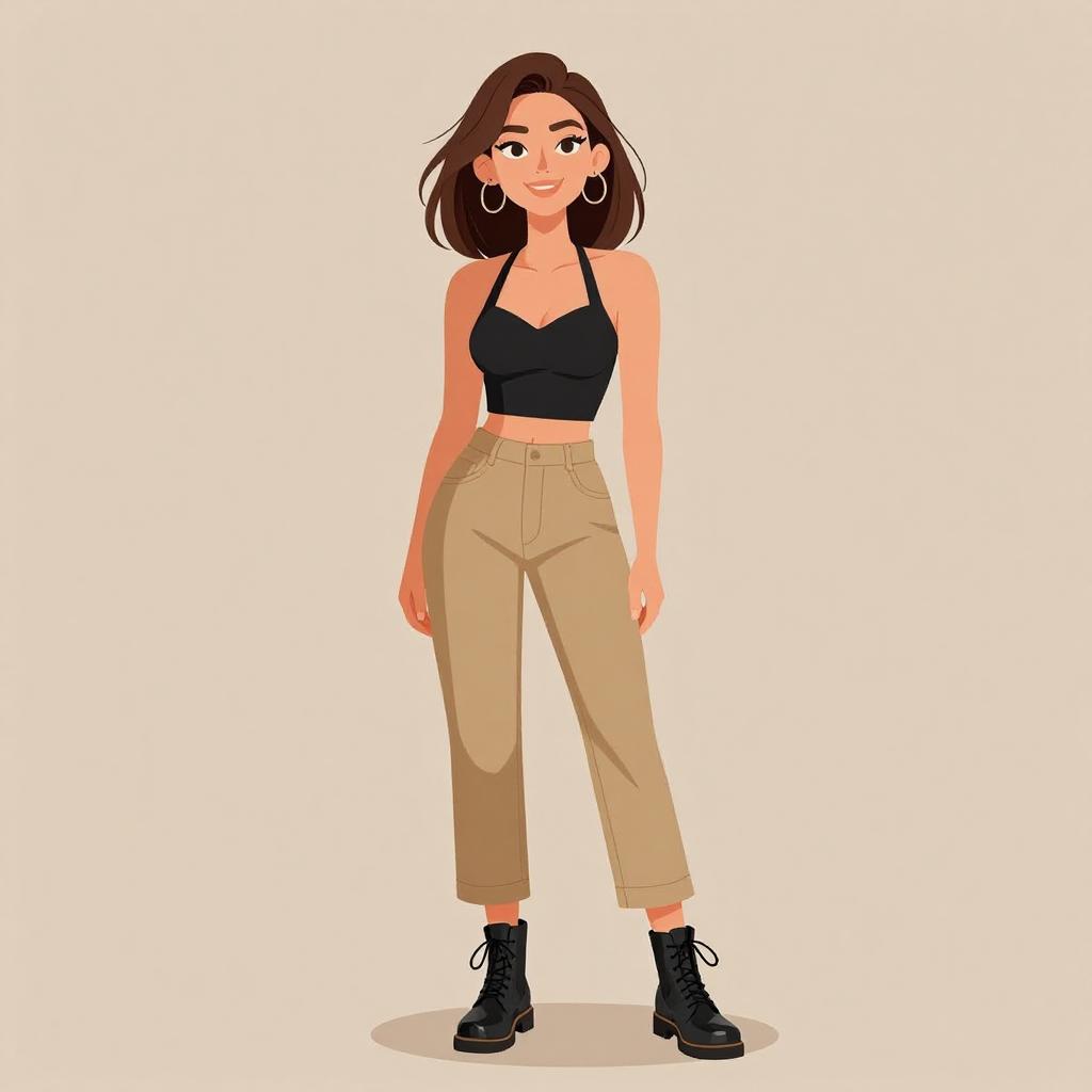Digital illustration of a smiling woman with brown hair, wearing a black long-sleeve top, tan high-waisted pants, and black sneakers,