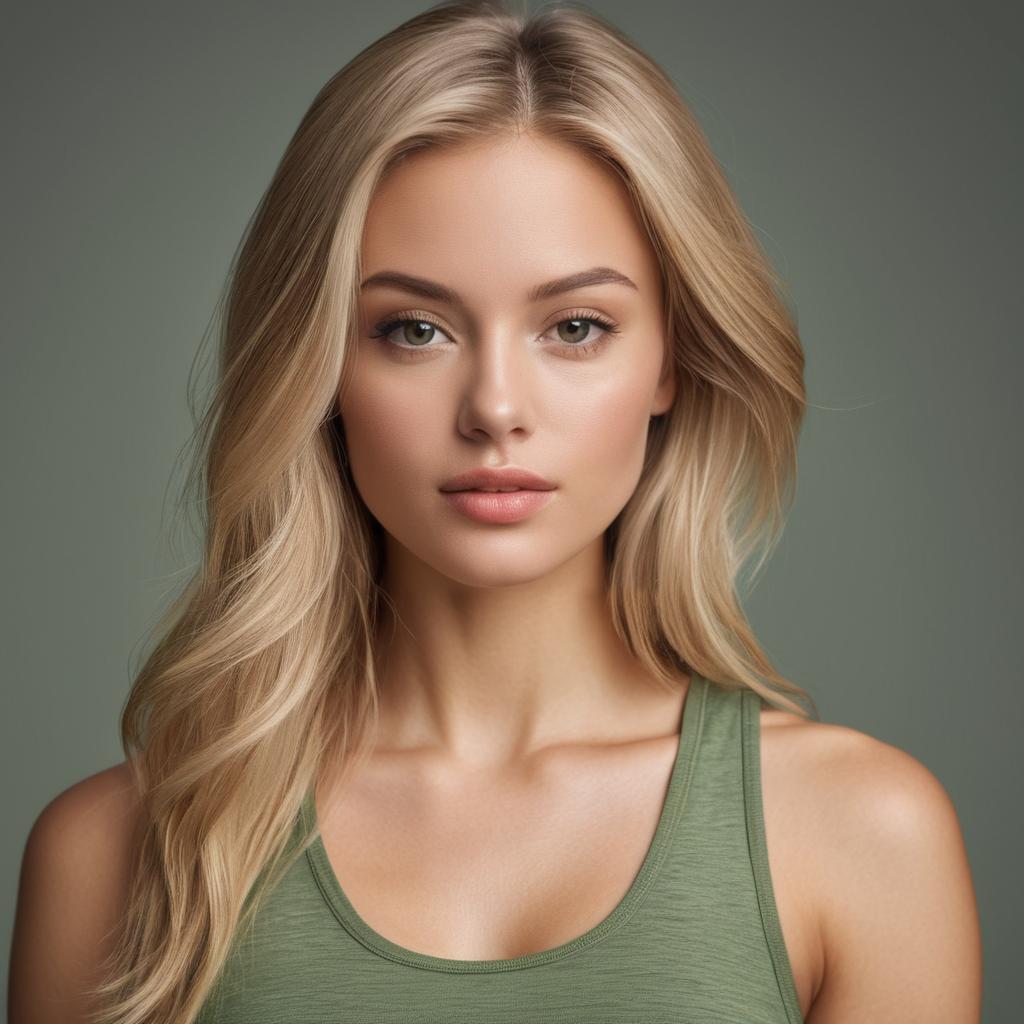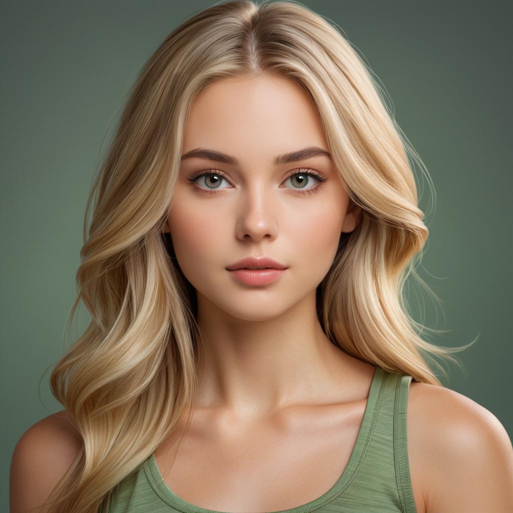 Realistic portrait of a young woman with long blonde hair, soft natural lighting on her face and hair, subtle makeup highlighting her lips and eyes, wearing a green tank top, neutral gray background, warm skin tones, contemporary style, focused on upper body and face