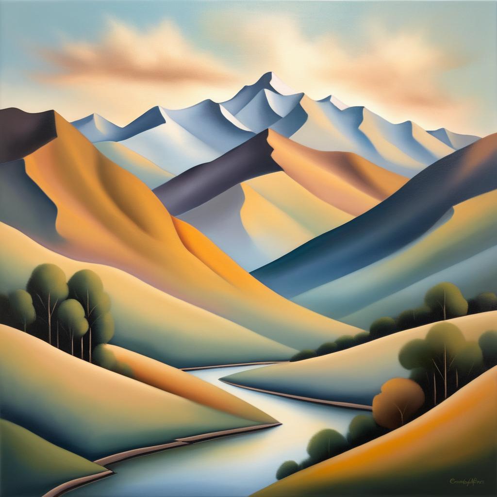 Mountain landscape, in the style of Georgia O'Keeffe, natural soft lighting, medium dynamic range, earthy, muted, subtle color palette, lightly saturated pastel colors, textured oil painting on smooth canvas with gentle brush strokes, serene composition, tranquil award winning art,