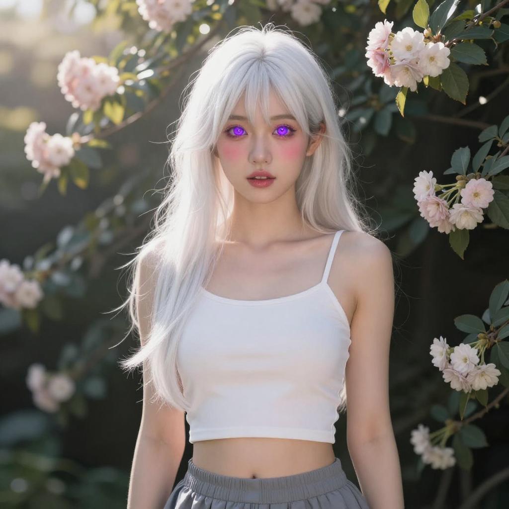 Realistic, 1girl, white hair, purple eyes, glowing eyes, crop top, skirt, parted lips, blush, night, flowers, sun, sunlight