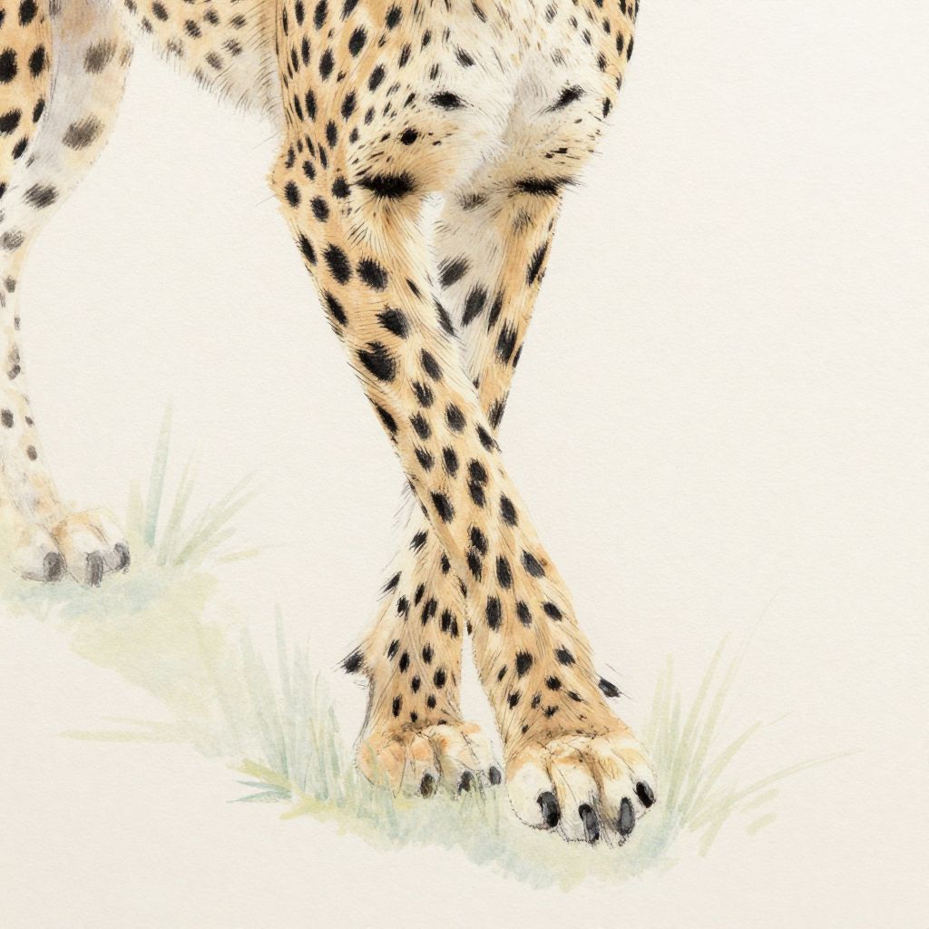 Cheetah legs drawing capturing the elegance of feline limbs, emphasizing slender form and flexible joints, using soft pastel colors and subtle brush strokes on textured paper, conveying the essence of swift predatory movement in a semi-abstract composition.