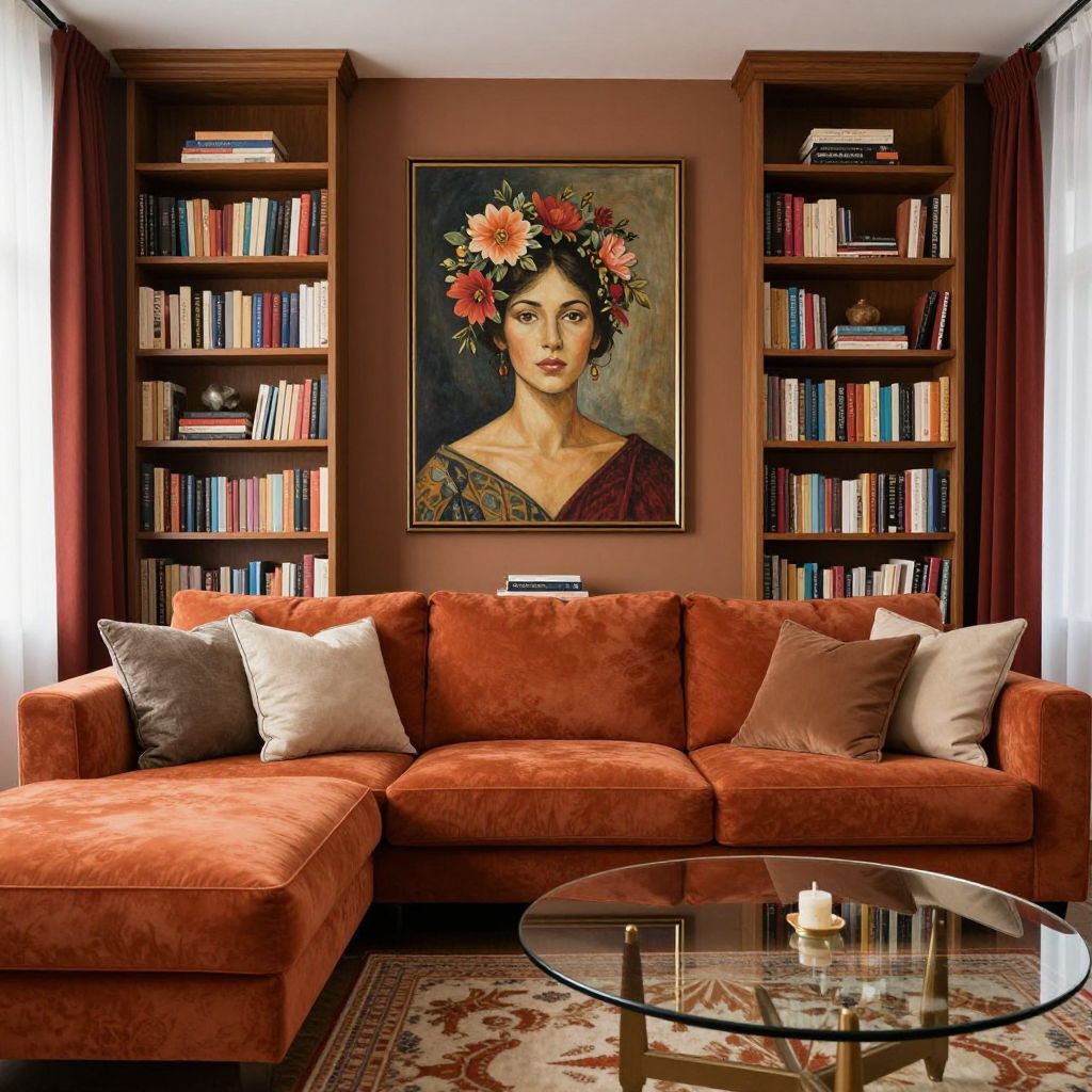 Cozy living room library featuring a plush burnt-orange sectional sofa adorned with neutral and earth-toned pillows, positioned beneath a striking portrait of a woman with floral headpiece, flanked by two tall wooden bookshelves filled with books, all set against warm brown walls and complemented by a round glass coffee table, patterned rug, and red curtains with sheer white panels.