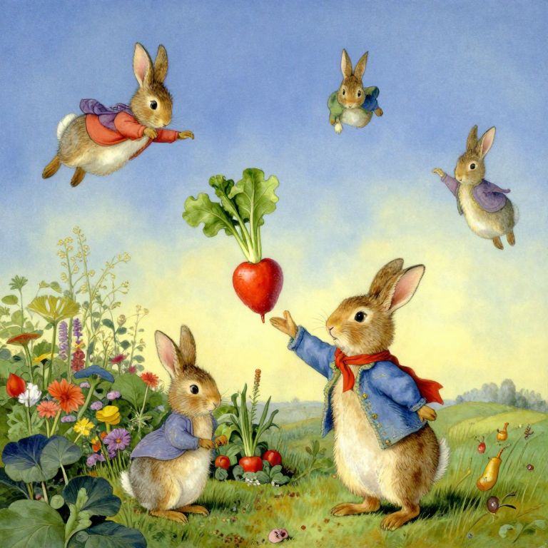 Craft an image embodying the dreamlike Surrealism reminiscent of Marc Chagall's work harmoniously fused with Beatrix Potter's whimsical illustrations. Depict a surreal landscape where a curious character resembling the artist's signature floating figures reaches out to pluck a vivid vegetable from Peter Rabbit's garden, which floats in mid-air. Capture this peculiar encounter from an unconventional viewpoint that evokes curiosity and wonder as the scene transitions smoothly across an emotional gradient, reflecting both innocence and intrigue inherent in this fantastical interpretation of familiar characters in an enchanting new setting.