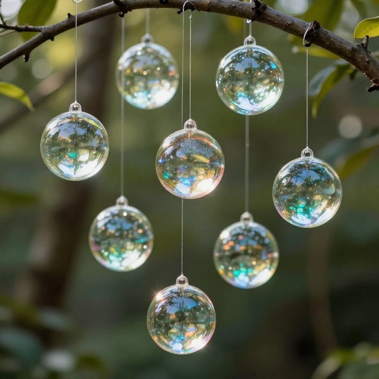 Suspended glass orbs dangle gracefully from tree branches, their iridescent surfaces catching sunlight and casting shimmering reflections in a serene woodland setting.